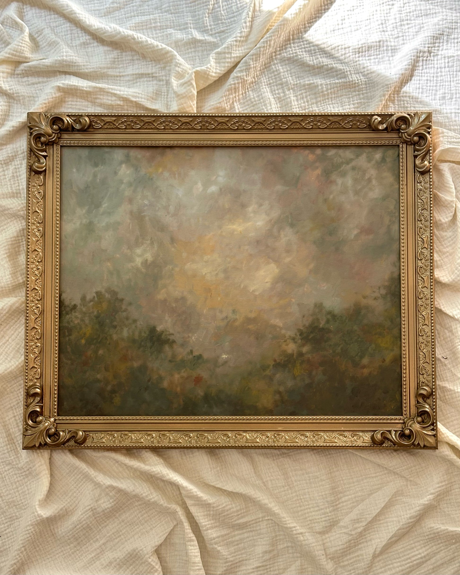 Painting measures 16”x20", frame measures 19”x23”. Framed canvas—no glass. Frame includes hanger on back.