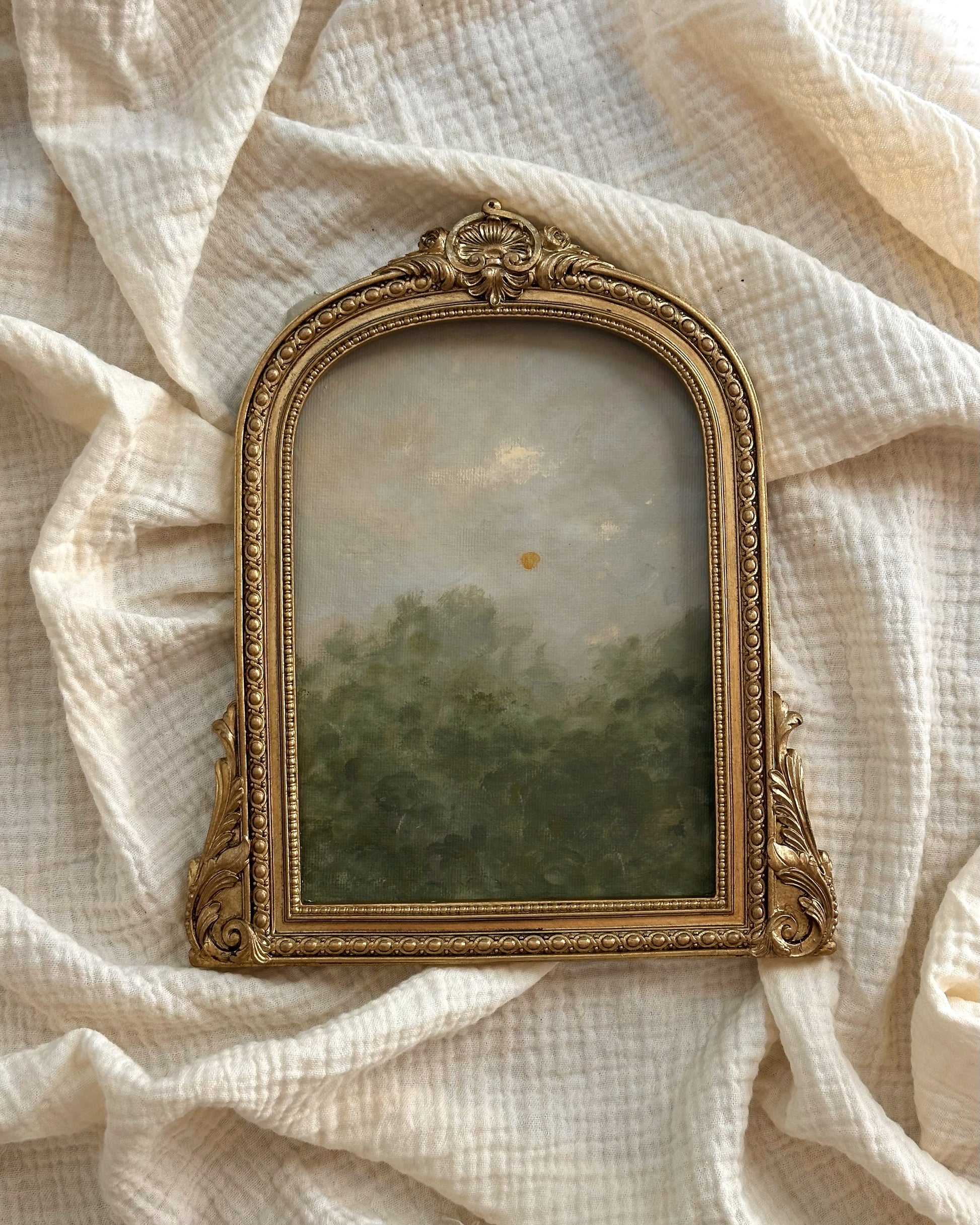 Painting measures 5”x7", frame measures 7.5”x8.5”. Frame includes stand and hanger on back.