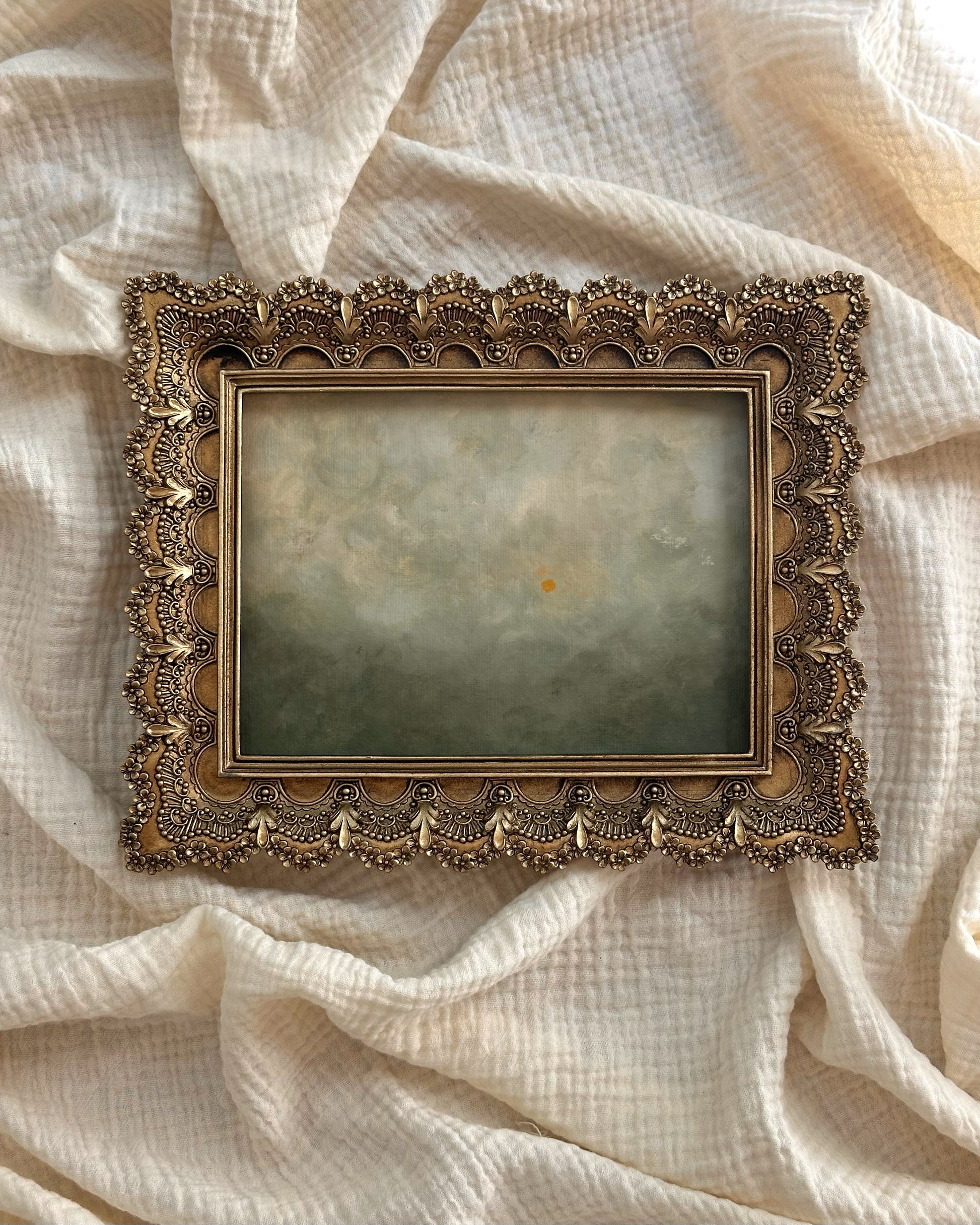Painting measures 5”x7", frame measures 7.5”x9.5”. Frame includes stand and hanger on back.