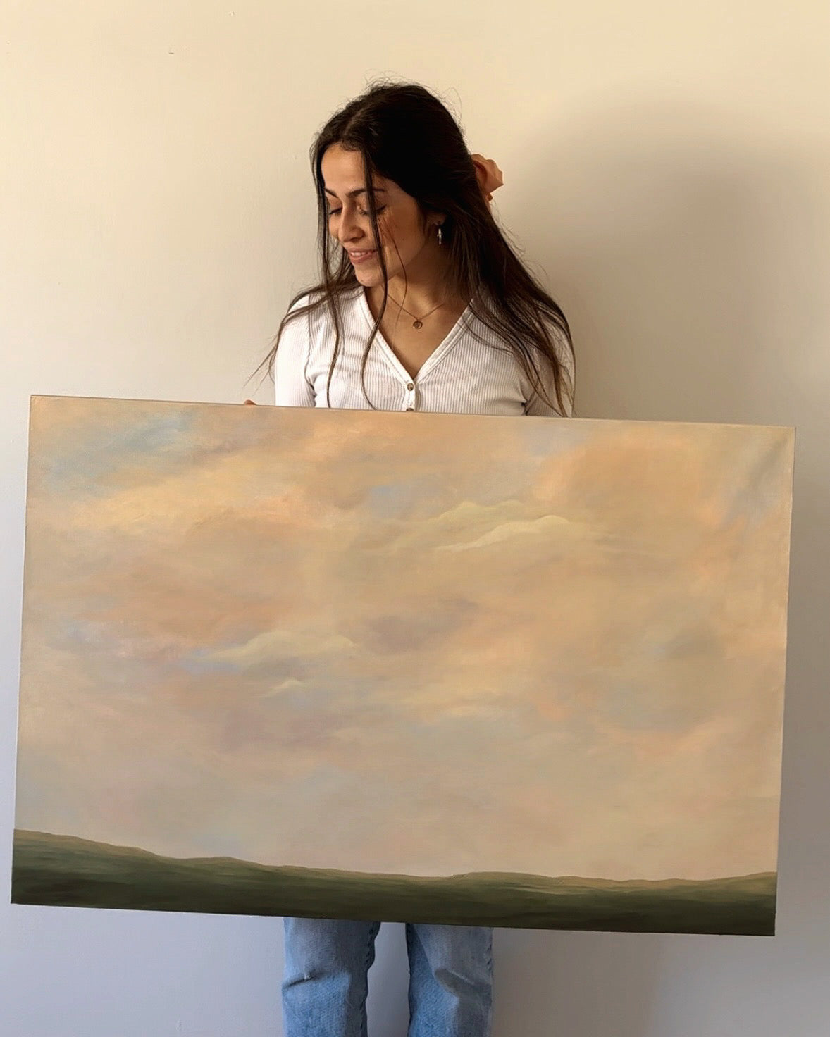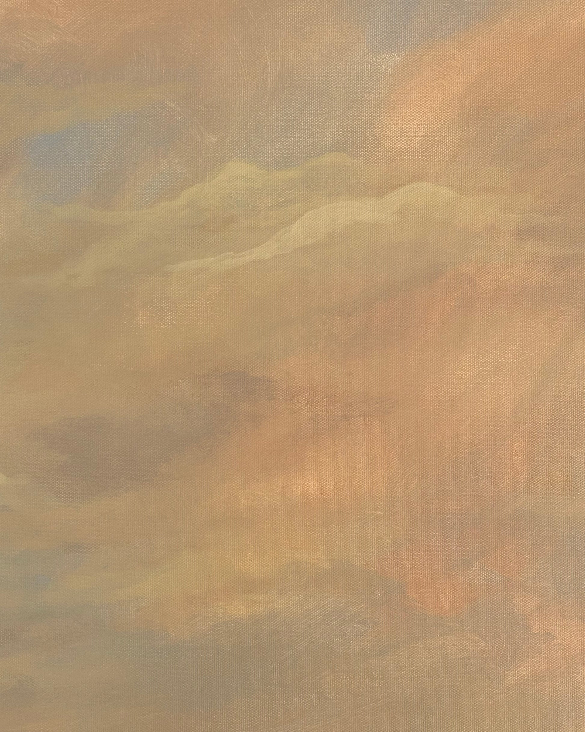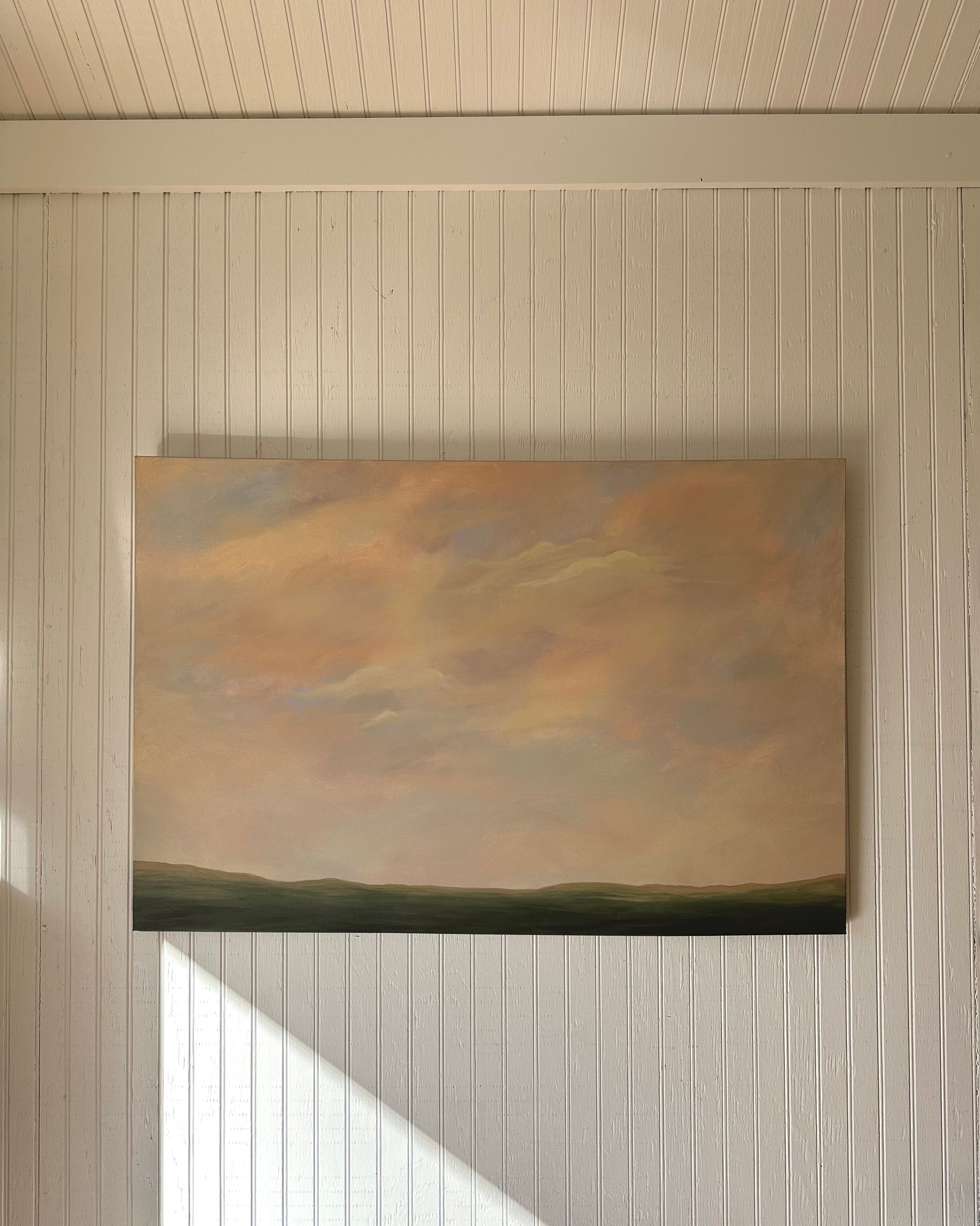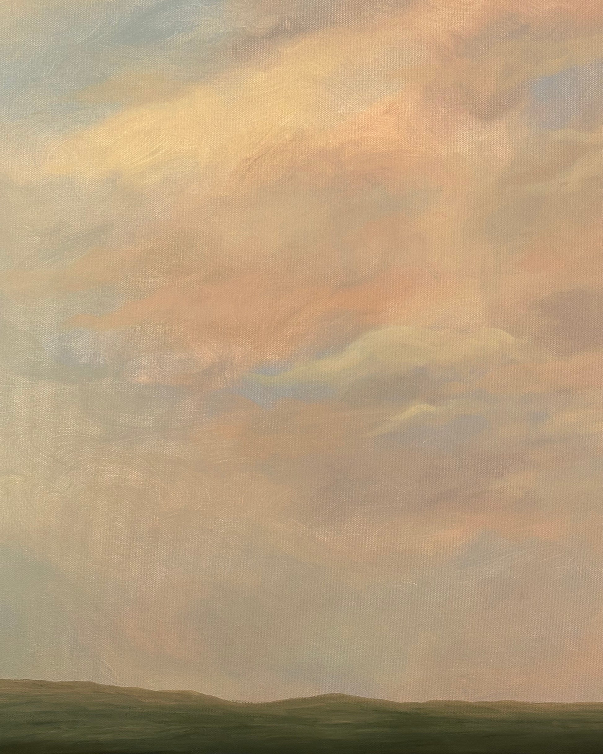 Unframed original 24”x36” acrylic landscape painting on canvas with the word “love” blended into the sky.