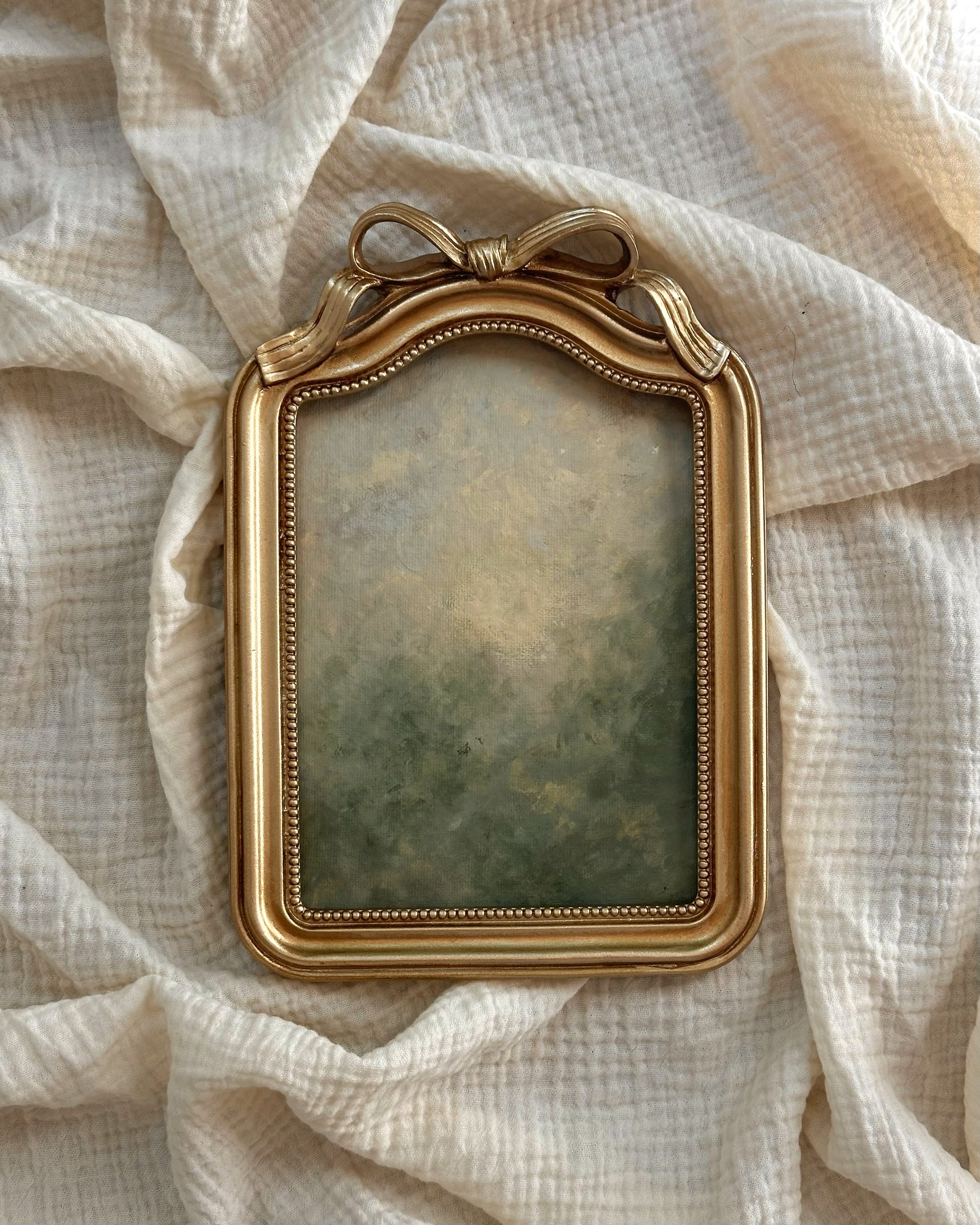 Painting measures 5”x7", frame measures 6”x9”. Frame includes stand on back, no hanger.