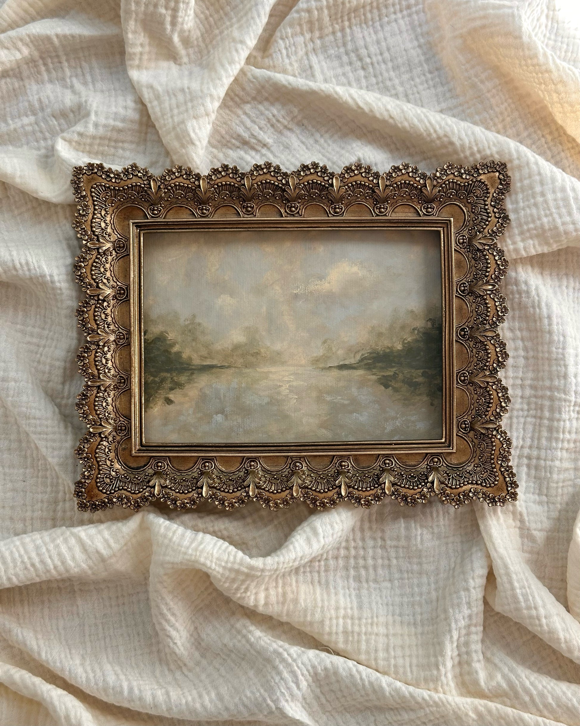 Painting measures 5”x7", frame measures 7.5”x9.5”. Frame includes stand and hanger on back.